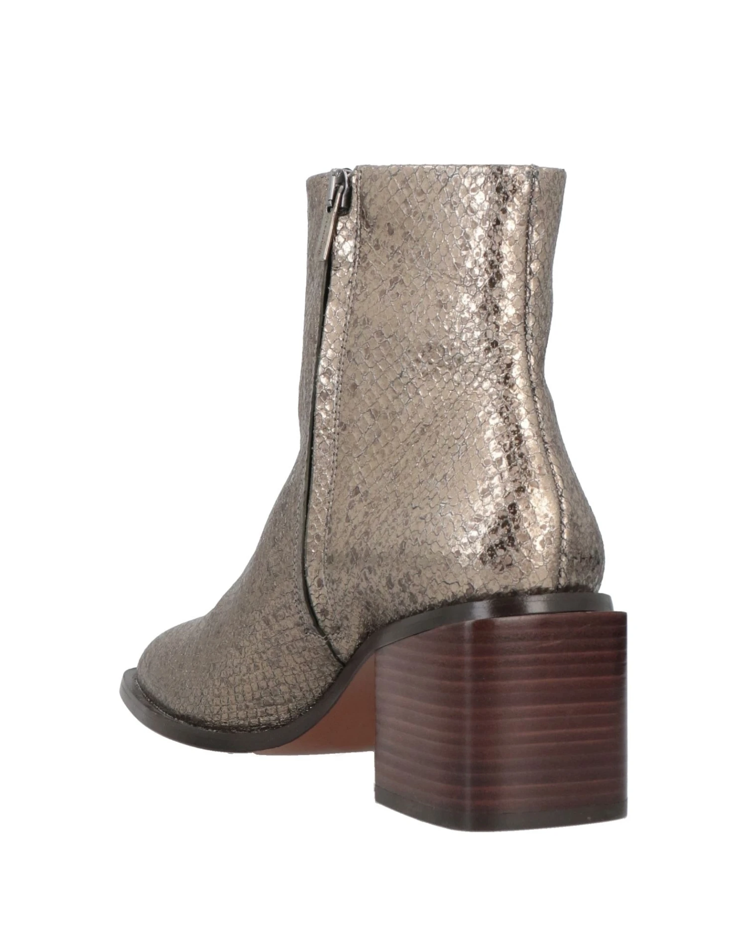 leather, snakeskin print, laminated effect, no appliqués, solid color, leather backing, zipper closure, narrow toeline, square heel, rubber sole, contains non-textile parts of animal origin, ankle boots