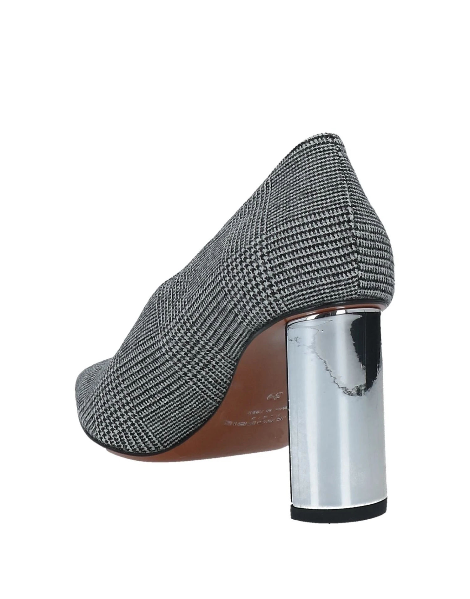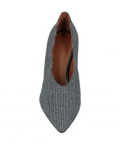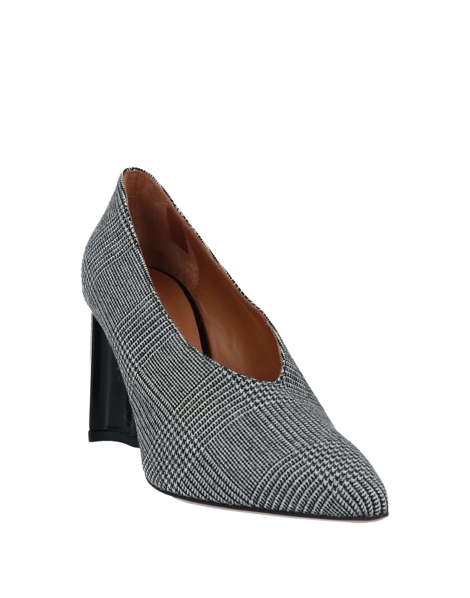 plain weave, no appliqués, glen plaid, square heel, narrow toeline, leather lining, leather sole, contains non-textile parts of animal origin