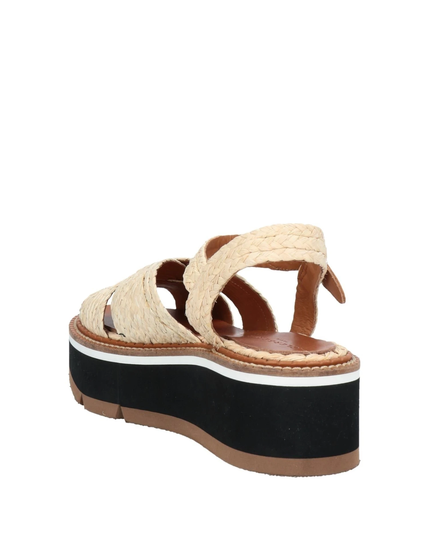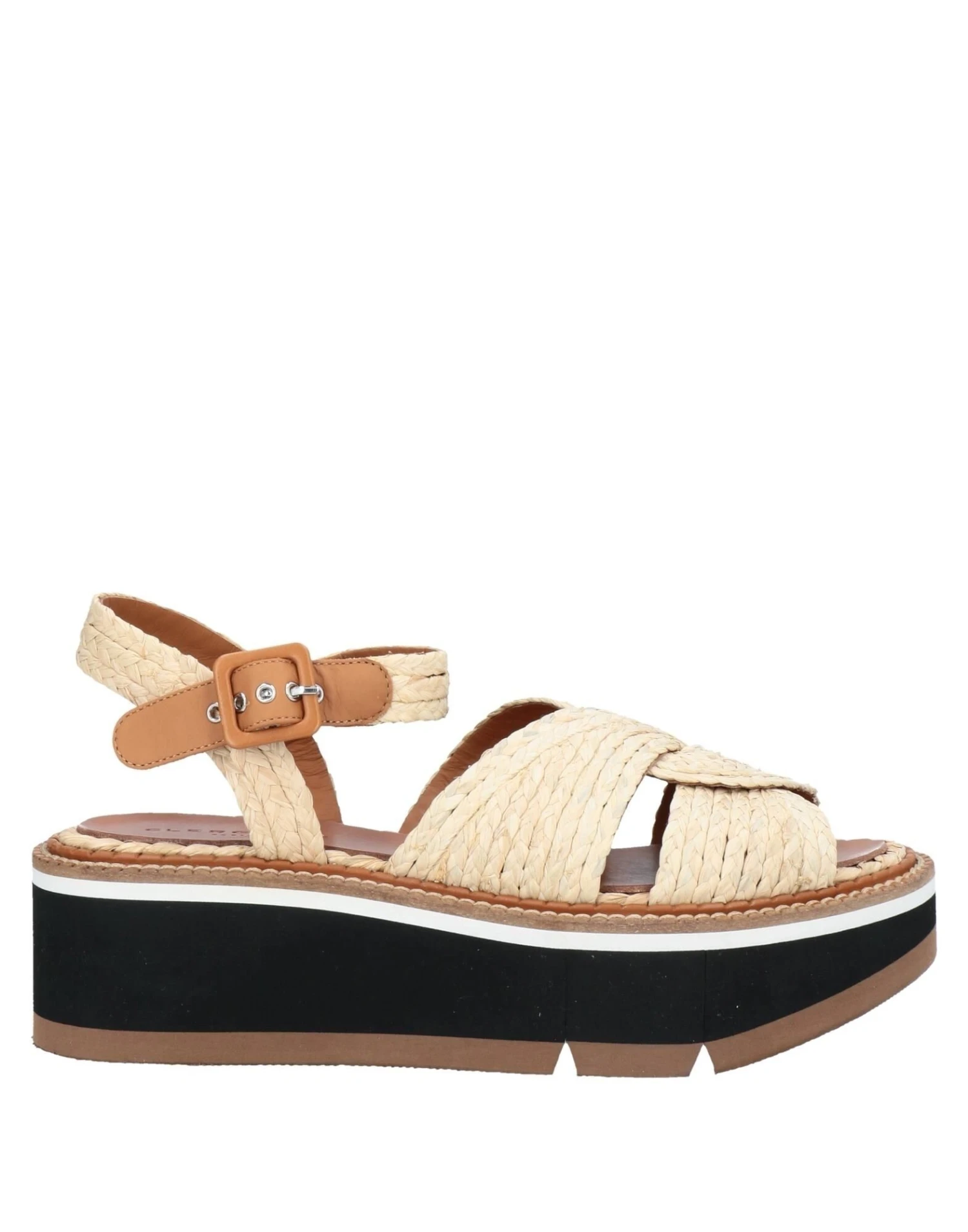 leather applications, solid color, leather backing, buckling ankle strap closure, round toeline, wedge heel, rubber cleated sole, contains non-textile parts of animal origin